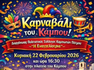 Ελάτε στο Καρναβάλι του Κάμπου. Μασκαρευτείτε και διασκεδάστε. Πολλές οι εκπλήξεις ! Πατμιακά Χρονικά 21/02/2026 Τουρισμός