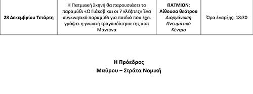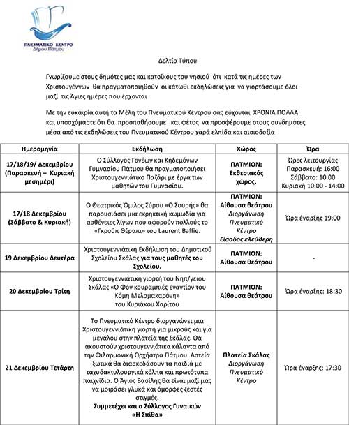 ΕΟΡΤΑΣΤΙΚΟ ΠΡΟΓΡΑΜΜΑ ΠΝΕΥΜΑΤΙΚΟΥ ΚΕΝΤΡΟΥ Δημοσιεύθηκε : Τρίτη, 13 Δεκεμβρίου 2016 12:12 | Γράφτηκε από τον/την Patmostimes fΚοινοποίησέ το στους φίλους σου Tweet