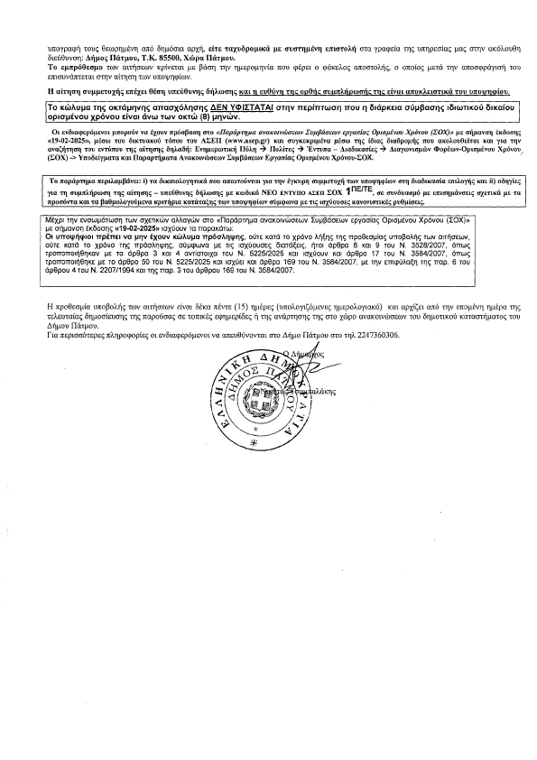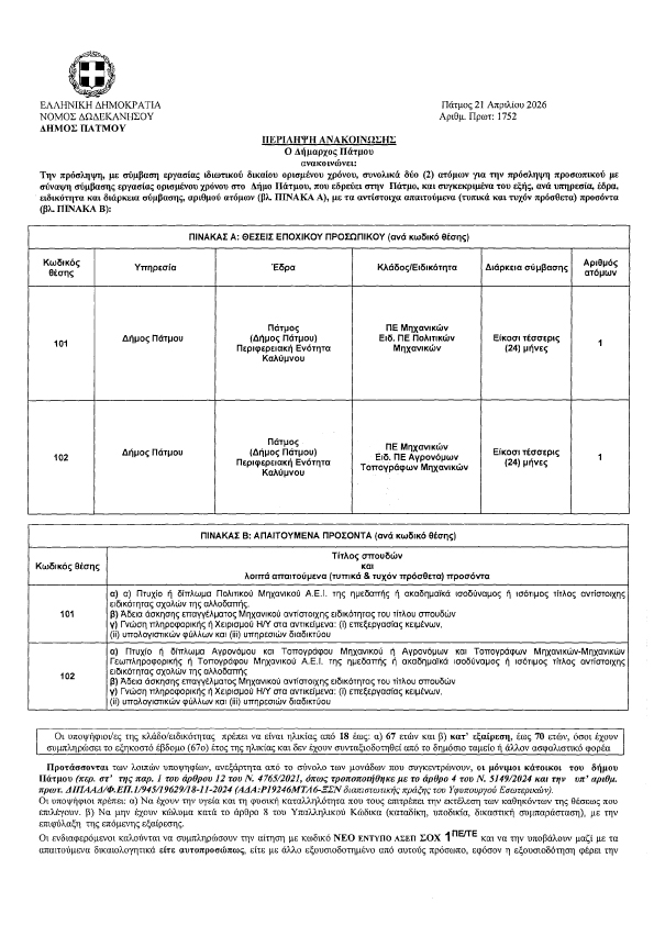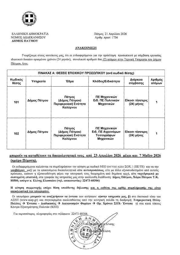 Ανακοίνωση πρόσληψης μηχανικών στο Δήμο Πάτμου για 24 μήνες 21 Απριλίου 2026 12:34 / Επικαιρότητα / Από Πατμιακά Χρονικά Δύο θέσεις προκηρύσσει ο Δήμος Πάτμου. Η μία θέση για Πολιτικό μηχανικό ΠΕ και η δεύτερη Αγρονόμο τοπογράφο Μηχανικό Π.Ε. Κοινοποιήστε: