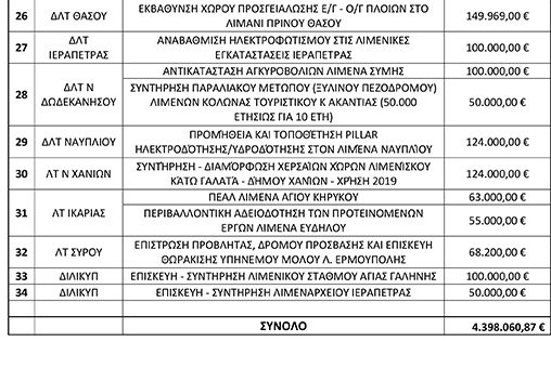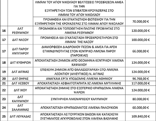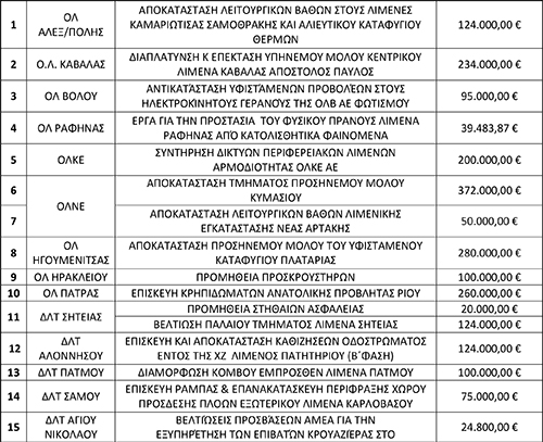 Ειδικότερα, στον πίνακα που ακολουθεί μπορείτε να δείτε αναλυτικά τα επιμέρους 39 λιμενικές εγκαταστάσεις για τις οποίες εγκρίθηκαν οι εν λόγω δαπάνε.