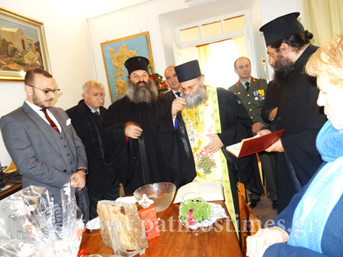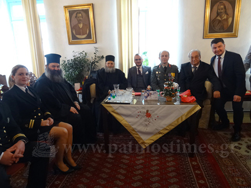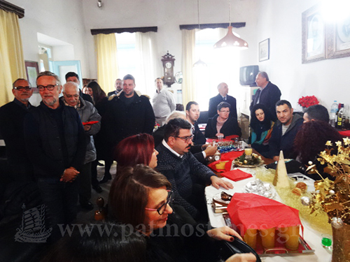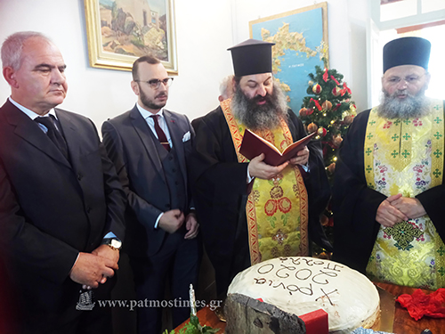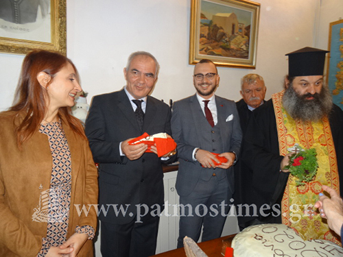 Ακολούθως όλοι μαζί με τη συνοδεία του δημάρχου, μετέβησαν στο δημαρχείο όπου μετά τον αγιασμό που έγινε για το νέο έτος, 2020 πραγματοποιήθηκε η κοπή της πρωτοχρονιάτικης πίτας , με κερδισμένο και τυχερό της ημέρας τον Γιάννη Κωνσταντά στο κομμάτι του οποίου βρέθηκε το νόμισμα κερδίζοντας ταυτόχρονα και εισιτήρια από Πάτμο προς Πειραιά . Αμέσως μετά σε ένα σύντομο χαιρετισμό του ο ηγούμενος έδωσε τις ευχές του στο νέο δήμαρχο και στους δημοτικούς συμβούλους. Ακολούθησαν οι σύντομες ευχές του νέου δημάρχου κ. Λευτέρη Πέντε όπου μεταξύ άλλων ευχήθηκε να είναι καλότυχο και δημιουργικό το 2020. να φέρει υγεία, ευημερία , ειρήνη και σύμπλευση για την πρόοδο των κατοίκων του νησιού μας.