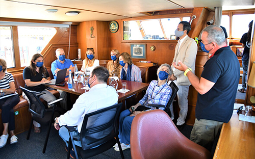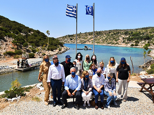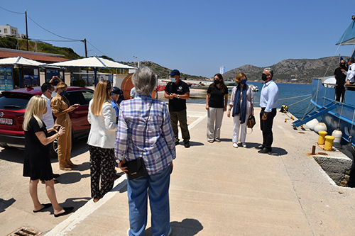 Τηρώντας όλα τα απαραίτητα μέτρα για την αποφυγή της εξάπλωσης της πανδημίας, επισκέφθηκαν πρώτα το ερευνητικό σκάφος Aegean Explorer όπου ενημερώθηκαν για την πολυετή δράση του Ινστιτούτου Αρχιπέλαγος για την προστασία των ελληνικών θαλασσών. Οι ερευνητές εξήγησαν την μεθοδολογία καταγραφής της σπάνιας βιοποικιλότητας και των σημαντικών οικοσυστημάτων του Αιγαίου, καθώς και τους παράγοντες που τα απειλούν και τα μέτρα που είναι είναι απαραίτητο να εφαρμοστούν για την προστασία τους.