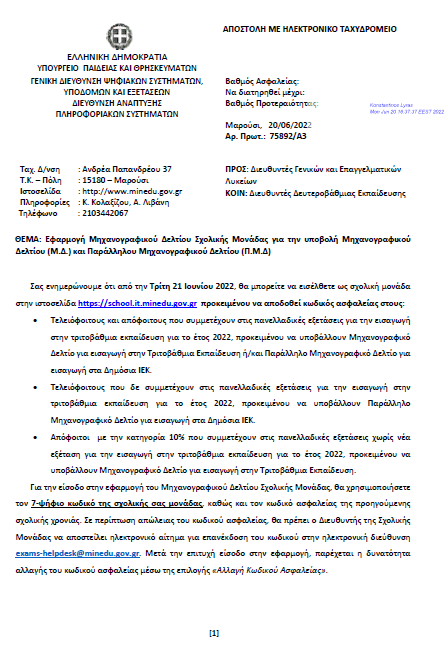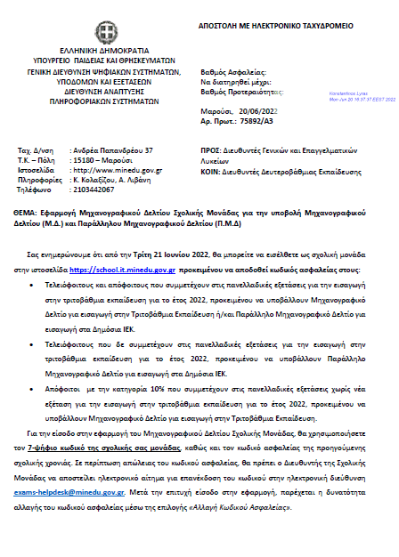 Β) τη Δημιουργία κωδικού ασφαλείας για την ηλεκτρονική υποβολή Μηχανογραφικού Δελτίου (Μ.Δ.) ΓΕΛ για εισαγωγή στην Τριτοβάθμια Εκπαίδευση και Παράλληλου Μηχανογραφικού Δελτίου (Π.Μ.Δ.) για εισαγωγή σε Δημόσια ΙΕΚ έτους 2022.