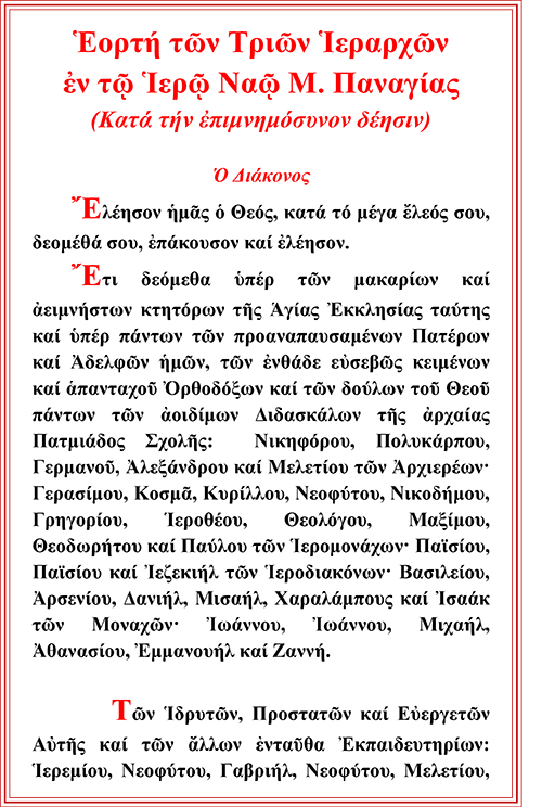 Τρίτη 30 Ιανουαρίου 2024 όπως κάθε χρόνο εορτάστηκαν οι Τρεις Ιεράρχες στον Δημοτικό Ιερό Ναό Μεγάλης Παναγιά όπου εκτός από την πανηγυρική Θεία Λειτουργία τελείτα το μνημόσυνο των Δωρητών του Δήμου, των ιδρυτών, αφιερωτών και ευεργετών των σχολών της Πάτμου.