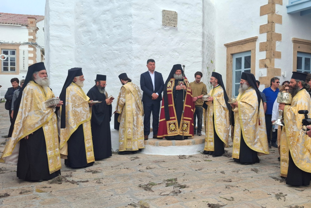 Εκεί τελείται αγιασμός και στη συνέχεια οι συγκεντρωθέντες προσκυνούν τις εικόνες και τα ιερά λείψανα, που περιμετρικά βρίσκονται στην πλατεία και αγιάζονται από τον ηγούμενο της Πάτμου.