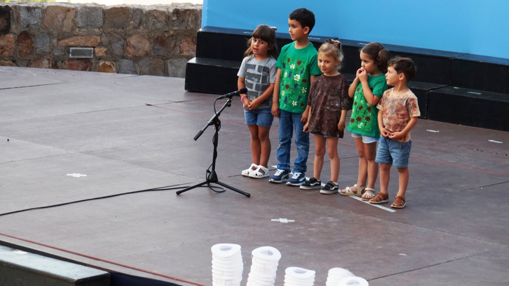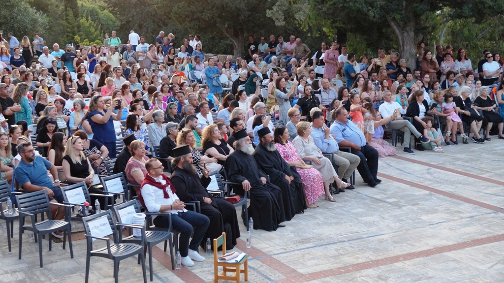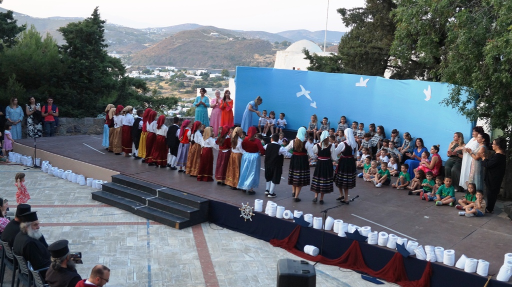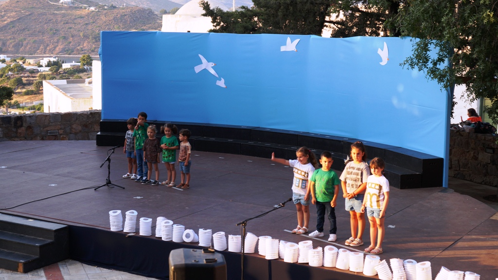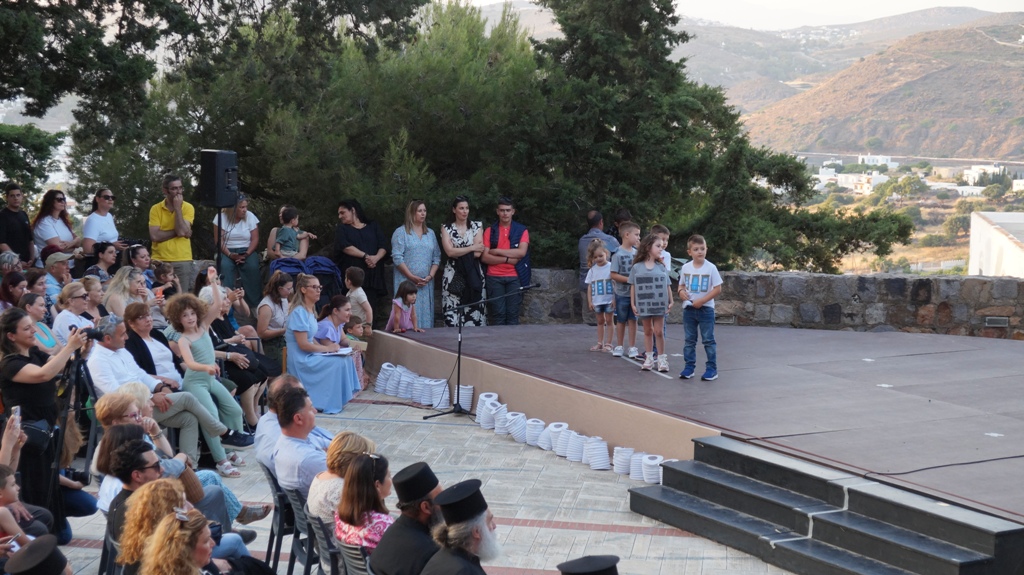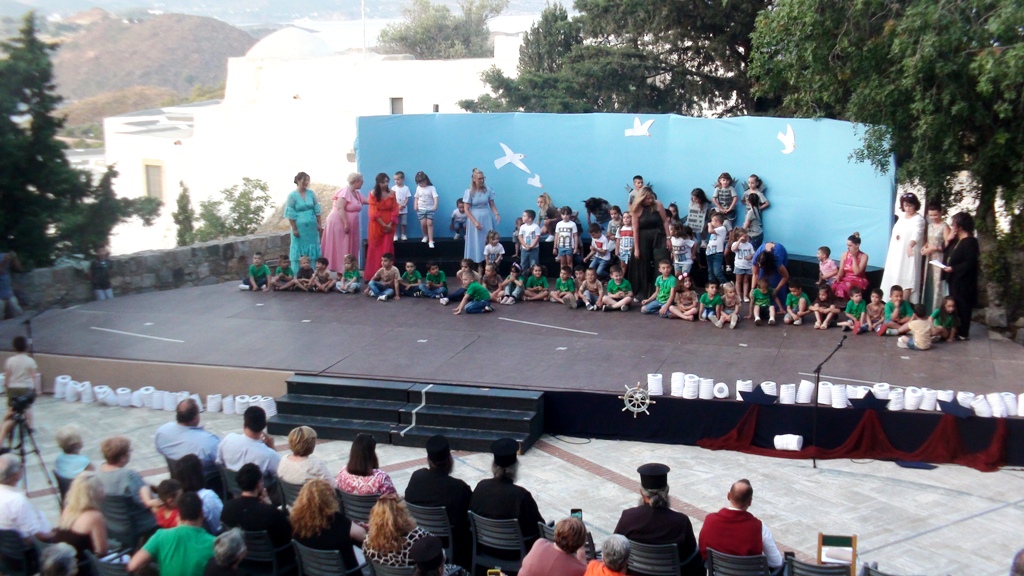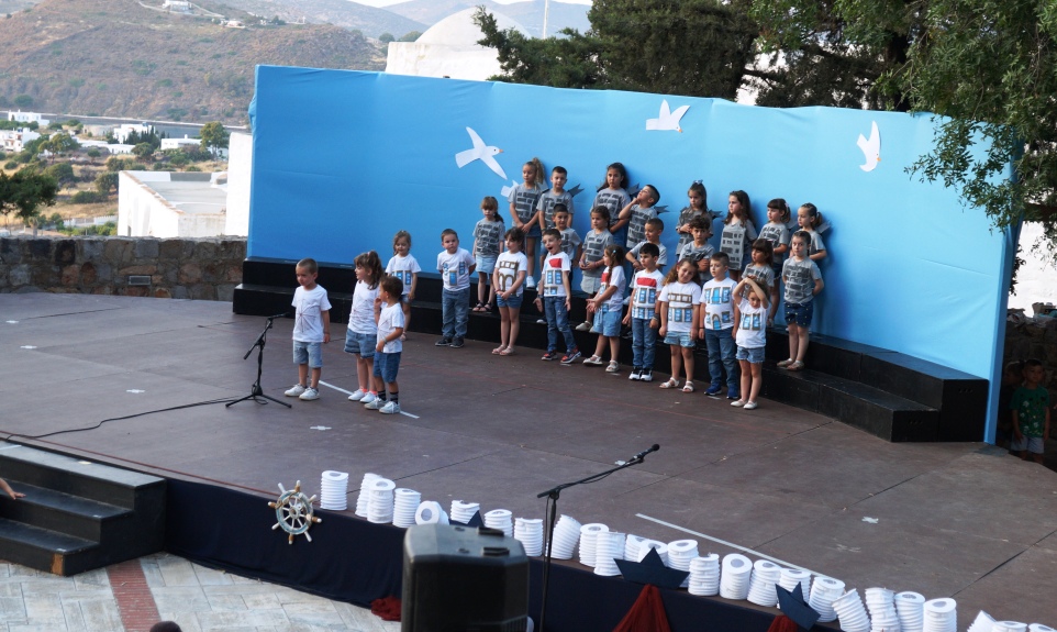 Πραγματοποιήθηκε την Παρασκευή 6 Ιουνίου ώρα 19:00 στον υπαίθριο θεατρικό χώρο του Σπηλαίου της Αποκάλυψης. αυτή είναι πολύ ξεχωριστή, γιατί πρωταγωνιστούν τα παιδιά των τριών νηπιαγωγείων της Πάτμου. Θαυμάσαμε την εξωστρέφεια των μικρών παιδιών στην απόδοση του ρόλου που τους είχε ανατεθεί καθώς και ότι στο σύνολο τους πολύ λίγες φορές χρειάστηκε η βοήθεια της υποβολέως, (Ιωάννα Βιολέντη) η οποία ήταν πάντα έτοιμη να βοηθήσει τα παιδιά.