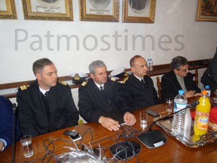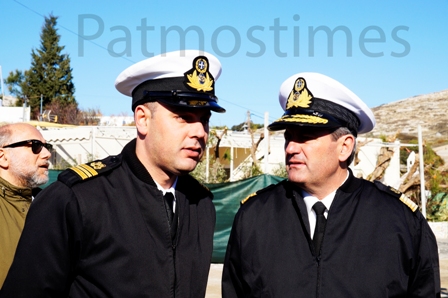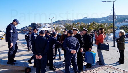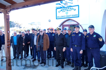 Στη μικρής διάρκειας επίσκεψη στο λιμεναρχείο ο λιμενάρχης του απένειμε την πλακέτα του λιμεναρχείου Πάτμου και φωτογραφήθηκε με όλο το επιτελείο και το κλιμάκιο στην είσοδο του λιμεναρχείου. Μετά από μια μικρή στάση που έκανε για να χαιρετήσει το πλήρωμα του πλοίου του Λιμενικού σώματος που ήταν αγκυροβολημένο στο λιμάνι μας, μετέβη στο Δημαρχείο.