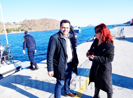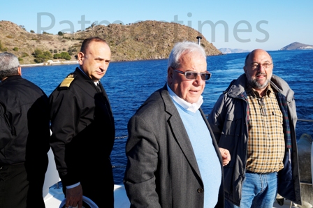 Ξεκινήσαμε από Πάτμο με το σκάφος του σωματείου Λεμβούχων ΕΙΡΗΝΗ και καπετάνιο τον Νίκο Μελιανό, ο δήμαρχος, ο αντιπρόεδρος του Λιμενικού ταμείου, 2 αστυνομικοί , η εφημερίδα ΠΑΤΜΙΑΚΑ ΧΡΟΝΙΚΑ και η τηλεόραση KΟΣΜΟΣ με τον Κώστα Σταμπούλη και τον Νίκο Μελιανό αντίστοιχα , ενώ είχε ήδη φύγει το σκάφος του λιμενικού με τον λιμενάρχη της Πάτμου κ. Στέλιο Σιάρμπα, περιμένοντας το υπουργικό κλιμάκιο στην είσοδο του Φαρμακονησίου, προερχόμενο από Κω, όπου έφτασε γύρω στις 1 το μεσημέρι με λιμενικό σκάφος της Κω από την νησίδα Καλόλιμνο όπου ήταν ο πρώτός σταθμός της περιοδείας του υπουργού. Ο υπουργός συνοδευόταν από τον Υφυπουργό κ. Νεκτάριο Σαντορινιό, τον αρχηγό του Λιμενικού Σώματος-Ελληνικής ακτοφυλακής κ. Σταμάτη Ράπτη και τον διοικητή της 8ης Περιφερειακής Διοίκησης Λιμενικού σώματος Αρχιπλοίαρχο κ. Ιωάννη Αργυρίου και οι βουλευτές του νομού κ. Δημήτρης Γάκης και Ηλίας Καματερός. Η φρουρά στο Φαρμακονήσι χάρισε στον Υπουργό Ναυτιλίας και Νησιωτικής Πολιτικής, Παναγιώτη Κουρουμπλή τη σημαία που κυμάτιζε στον ιστό του νησιού, μοναδικοί κάτοικοι του οποίου είναι οι στρατιώτες και το κλιμάκιο των Ειδικών Δυνάμεων του Λιμενικού Σώματος Ελληνικής Ακτοφυλακής, που φρουρούν το ακριτικό νησί.