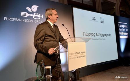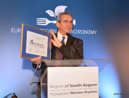 “ Οι νησιώτες είναι σήμερα ιδιαιτέρως υπερήφανοι. Αποτελεί εξαιρετική τιμή για μας το γεγονός ότι η Περιφέρειά μας, η μοναδική περιφέρεια της Ευρώπης όπου κάθε ένα από τα 52 νησιά της, έχει την δική του, ξεχωριστή, μοναδική πολιτιστική και γαστρονομική ταυτότητα, είναι εκείνη που φέρνει τον τίτλο της Γαστρονομικής Περιφέρειας της Ευρώπης, στη χώρα που γέννησε τον όρο “γαστρονομία”. Ένας ελληνικός όρος που υιοθετείται από όλες τις ευρωπαϊκές διαλέκτους, για να εισάγει μια νέα έννοια που ακόμη και στην εποχή μας δηλώνει την τέχνη και την επιστήμη της καλής διατροφής. Το Νότιο Αιγαίο συγκαταλέγεται πλέον μεταξύ των ευρωπαϊκών Περιφερειών με μεγάλη παράδοση στη γαστρονομία. Η διάκριση της Περιφέρειάς μας είναι η δική μας εξωστρεφής και αισιόδοξη απάντηση, σε μια δύσκολη περίοδο για τη χώρα μας. Τα νησιά του Νοτίου Αιγαίου, ως προμετωπίδα του ελληνικού τουρισμού, μπορούν με τον καλύτερο τρόπο να υπηρετήσουν και να υποστηρίξουν τον τίτλο της Ευρωπαϊκής Γαστρονομικής Περιφέρειας”.