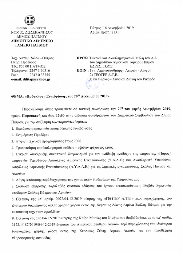 Αυτό ζήτησε  η εταιρεία ΥΔΡΟΠΛΑΝΑ ΕΛΛΑΔΑΣ Α.Ε. σε επιστολή της προς τον πρόεδρο του ΔΗΛΙΤΑΠ για να προχωρήσει στην κατασκευή του υδατοδρομίου όπως γράψαμε σε παλαιότερο δημοσίευμα μας  https://www.patmostimes.gr/category/11085-hellenic-seaplanes-30-5 .