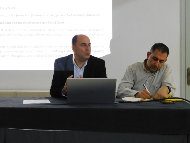 Εισηγητής ο Ιάκωβος Γρύλλης Πάτμιος την καταγωγή πολιτικός μηχανικός της εταιρείας Εξέλιξης- (Σύμβουλοι Ανάπτυξης) με έδρα τη Ρόδο. Επίσης διαφωτιστικές ήταν οι αναφορές στην Ενέργεια και οι δυνατότητες που θα έχουν με τα προγράμματα για την εξοικονόμηση της από το συνεργάτη του μηχανολόγο  κ. Κωνσταντίνο  Συμιακό.