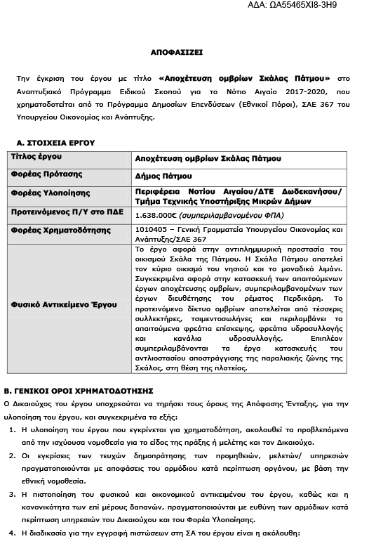«Το έργο διευθέτησης ομβρίων υδάτων στην περιοχή Σκάλας Πάτμου είναι από τα σημαντικότερα έργα υποδομής, αφού όταν ολοκληρωθεί η κατασκευή του θα σταματήσει το φαινόμενο της πλημμυρίδας μπροστά από την Αστυνομία και την πλατεία γιατί προβλέπει: