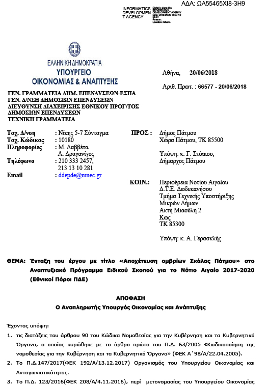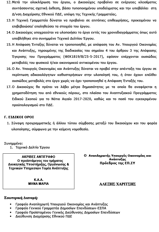 Παρακάτω η απόφαση της ένταξης του έργου από τον Αναπληρωτή Υπουργό Οικονομίας και Ανάπτυξης και πρόεδρο της ΕΠ.ΣΥ κ. Αλέξη Χαρίτση,
