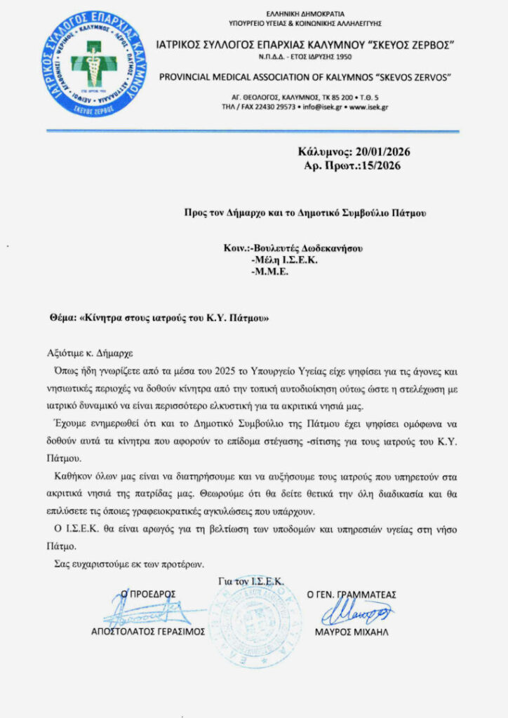 Ιατρικός σύλλογος επαρχίας Καλύμνου για το επίδομα στους ιατρούς του Κ.Υ.Πάτμου 21 Ιανουαρίου 2026 09:49 / Επικαιρότητα / Από Σμαράγδα Μουλιάτη Κοινοποιήστε: Ετικέτες: ΙΑΤΡΩΝ, ΙΣΕΚ, ΠΑΤΜΟΥ