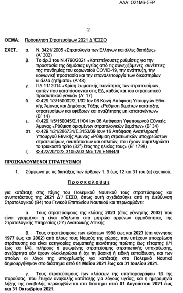 β. Τους στρατεύσιμους των κλάσεων 1998 έως και 2023 (έτη γέννησης 1977 έως και 2002) από όλους τους Νομούς της χώρας, που υπέχουν υποχρέωση στράτευσης και είναι κατηγορίας σωματικής ικανότητας πρώτης έως τέταρτης (Ι/1 έως και Ι/4), πλήρους ή μειωμένης στρατεύσιμης στρατιωτικής υποχρέωσης, ανεξάρτητα εάν έχουν ολοκληρώσει ή όχι τη βασική ή ειδική εκπαίδευση, και των οποίων οι λόγοι της υποχρέωσής για κατάταξη στο Πολεμικό Ναυτικό δημιουργήθηκαν στο διάστημα από 01 Μαΐου 2021 έως και 31 Ιουλίου 2021.