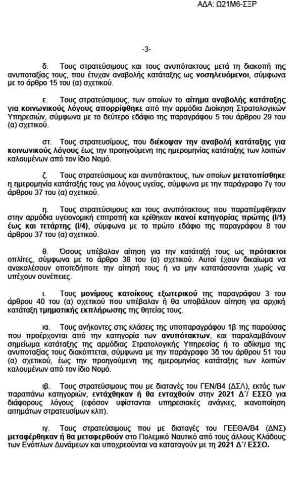 ιγ. Τους στρατεύσιμους που με διαταγές του ΓΕΕΘΑ/Β4 (ΔΝΣ) μεταφέρθηκαν ή θα μεταφερθούν στο Πολεμικό Ναυτικό από τους άλλους Κλάδους των Ενόπλων Δυνάμεων και υποχρεούνται να καταταγούν με τη 2021 Δ΄/ ΕΣΣΟ.