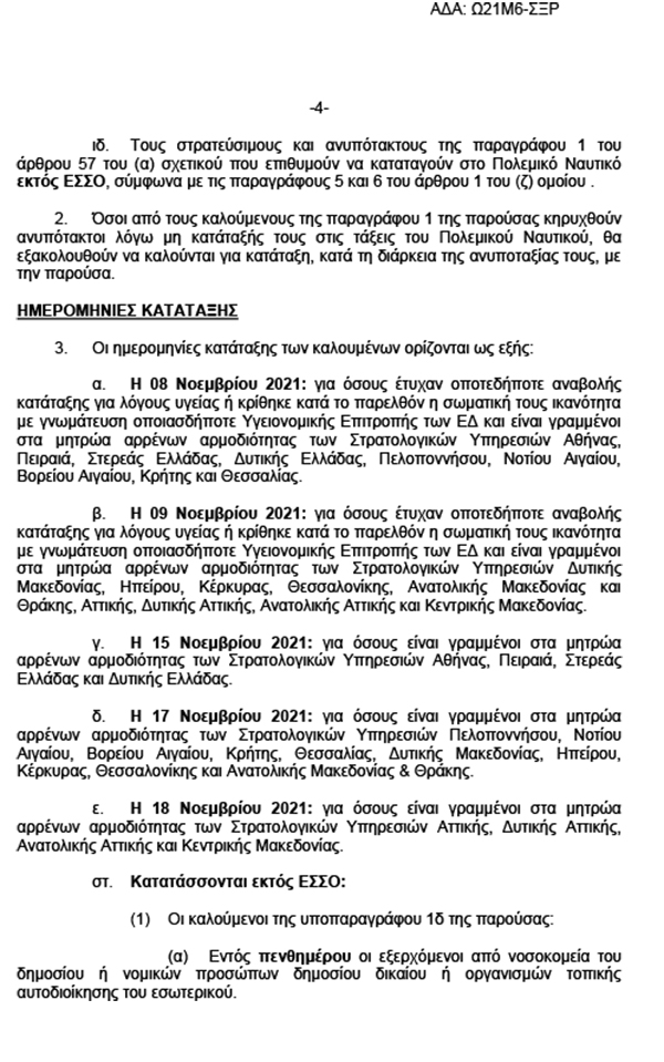 4. Οι παρουσιαζόμενοι αργότερα από την καθοριζόμενη για την κατηγορία τους ημερομηνία μέχρι και την 18 Νοεμβρίου 2021 να γίνονται δεκτοί για κατάταξη ως εκπρόθεσμοι, υπέχοντας μηνιαία πρόσθετη στρατιωτική υποχρέωση, σύμφωνα με την παράγραφο 12 του άρθρου 17 του (στ) σχετικού. Μετά την ημερομηνία αυτή να μην κατατάσσεται κανένας, πλην των αναφερομένων στην υποπαράγραφο 3στ και την παράγραφο 5 της παρούσας.