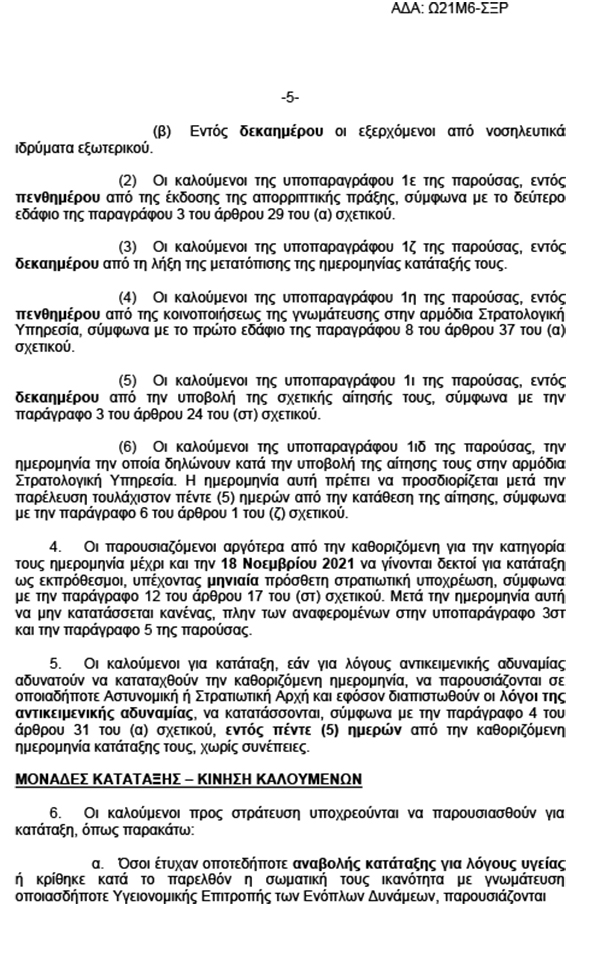 5. Οι καλούμενοι για κατάταξη, εάν για λόγους αντικειμενικής αδυναμίας αδυνατούν να καταταχθούν την καθοριζόμενη ημερομηνία, να παρουσιάζονται σε οποιαδήποτε Αστυνομική ή Στρατιωτική Αρχή και εφόσον διαπιστωθούν οι λόγοι της αντικειμενικής αδυναμίας, να κατατάσσονται, σύμφωνα με την παράγραφο 4 του άρθρου 31 του (α) σχετικού, εντός πέντε (5) ημερών από την καθοριζόμενη ημερομηνία κατάταξης τους, χωρίς συνέπειες.