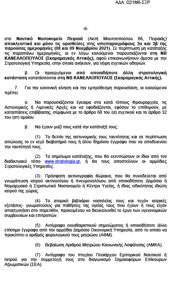 στο Ναυτικό Νοσοκομείο Πειραιά (Ακτή Μουτσοπούλου 66, Πειραιάς) αποκλειστικά και μόνο τις ορισθείσες στις υποπαραγράφους 3α και 3β της παρούσας ημερομηνίες (08 και 09 Νοεμβρίου 2021). Σε περίπτωση μη κατάταξης τις παραπάνω ημερομηνίες, οι εν λόγω καλούμενοι παρουσιάζονται στη ΝΒ ΚΑΝΕΛΛΟΠΟΥΛΟΣ (Σκαραμαγκάς Αττικής), αφού επικοινωνήσουν άμεσα με την Στρατολογική Υπηρεσία, στην οποία ανήκουν, για λήψη σχετικών οδηγιών.
