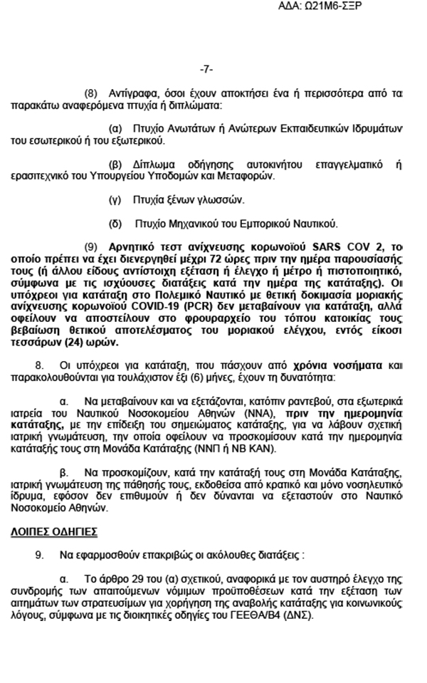 (9) Αρνητικό τεστ ανίχνευσης κορωνοϊού SARS COV 2, το οποίο πρέπει να έχει διενεργηθεί μέχρι 72 ώρες πριν την ημέρα παρουσίασής τους (ή άλλου είδους αντίστοιχη εξέταση ή έλεγχο ή μέτρο ή πιστοποιητικό, σύμφωνα με τις ισχύουσες διατάξεις κατά την ημέρα της κατάταξης). Οι υπόχρεοι για κατάταξη στο Πολεμικό Ναυτικό με θετική δοκιμασία μοριακής ανίχνευσης κορωνοϊού COVID-19 (PCR) δεν μεταβαίνουν για κατάταξη, αλλά οφείλουν να αποστείλουν στο φρουραρχείο του τόπου κατοικίας τους βεβαίωση θετικού αποτελέσματος του μοριακού ελέγχου, εντός είκοσι τεσσάρων (24) ωρών.