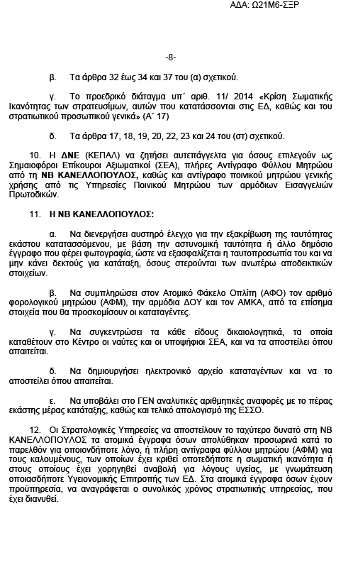10. Η ΔΝΕ (ΚΕΠΑΛ) να ζητήσει αυτεπάγγελτα για όσους επιλεγούν ως Σημαιοφόροι Επίκουροι Αξιωματικοί (ΣΕΑ), πλήρες Αντίγραφο Φύλλου Μητρώου από τη ΝΒ ΚΑΝΕΛΛΟΠΟΥΛΟΣ, καθώς και αντίγραφο ποινικού μητρώου γενικής χρήσης από τις Υπηρεσίες Ποινικού Μητρώου των αρμόδιων Εισαγγελιών Πρωτοδικών.