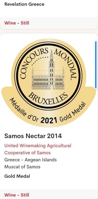 ΧΡΥΣΟ στο Samos Nectar 2014, το εκπληκτικό λιαστό του Συνεταιρισμού, παλαίωσης 6 ετών, με τον μοναδικό χαρακτήρα του Άσπρου Μοσχάτου και ΑΡΓΥΡΟ στο Samos Anthemis 2015, με τη μοναδική πολυπλοκότητα και την εξαιρετική ισορροπία.