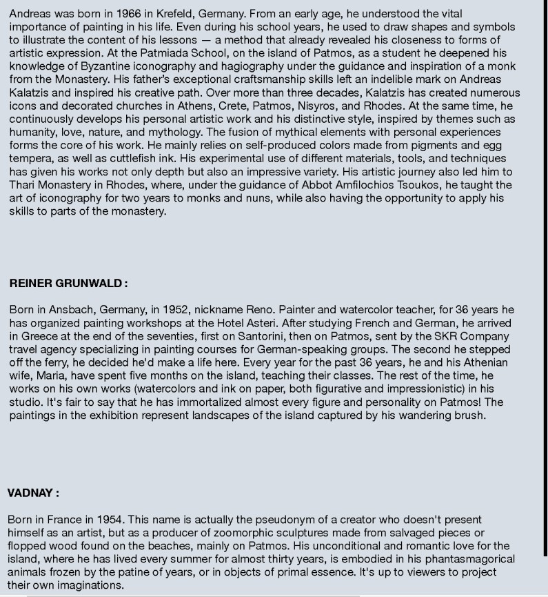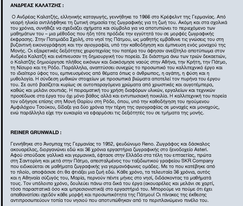 Στο πολιτιστικό κέντρο Πάτμιον 9 Ιουλίου 2025 ώρα 19:00, Άνοιξε τις πύλες της η έκθεση "ΚΑΛΛΙΤΕΧΝΕΣ ΕΡΩΤΕΥΜΕΝΟΙ ΜΕ ΤΗΝ ΠΑΤΜΟ" και θα έιναι ανοιχτή μέχρι 18 Ιουλίου.