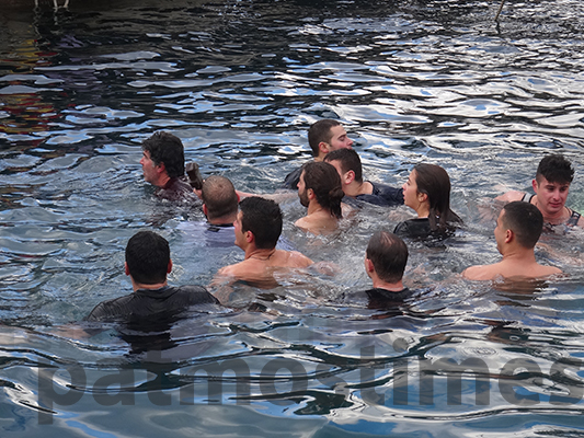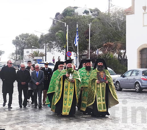 Στην εξέδρα, ιερείς ο δήμαρχος, αντιδήμαρχοι και οι αρχές του νησιού. Το σταυρό έπιασαν κατά σειράν : Χρήστος Γκέλης (λιμενικός), Μάριος Καστής και Δημήτρης Σκεμπές.